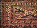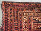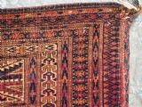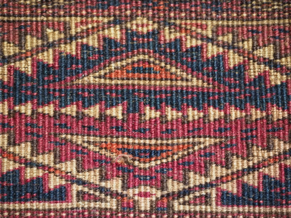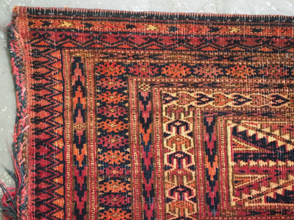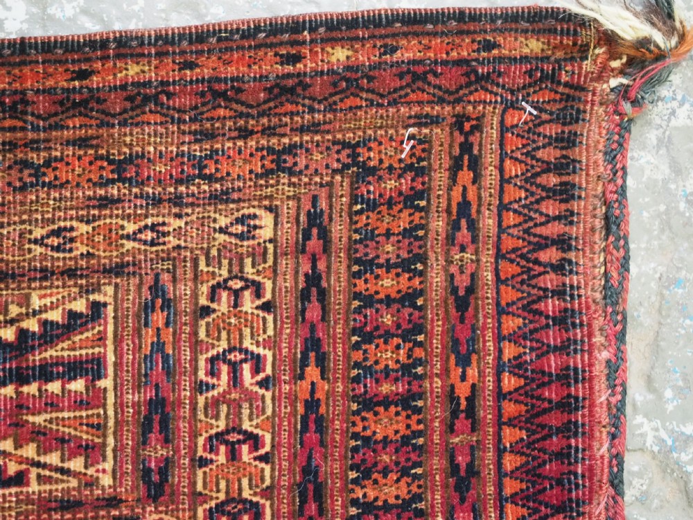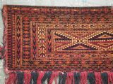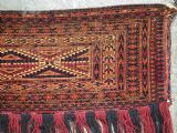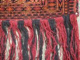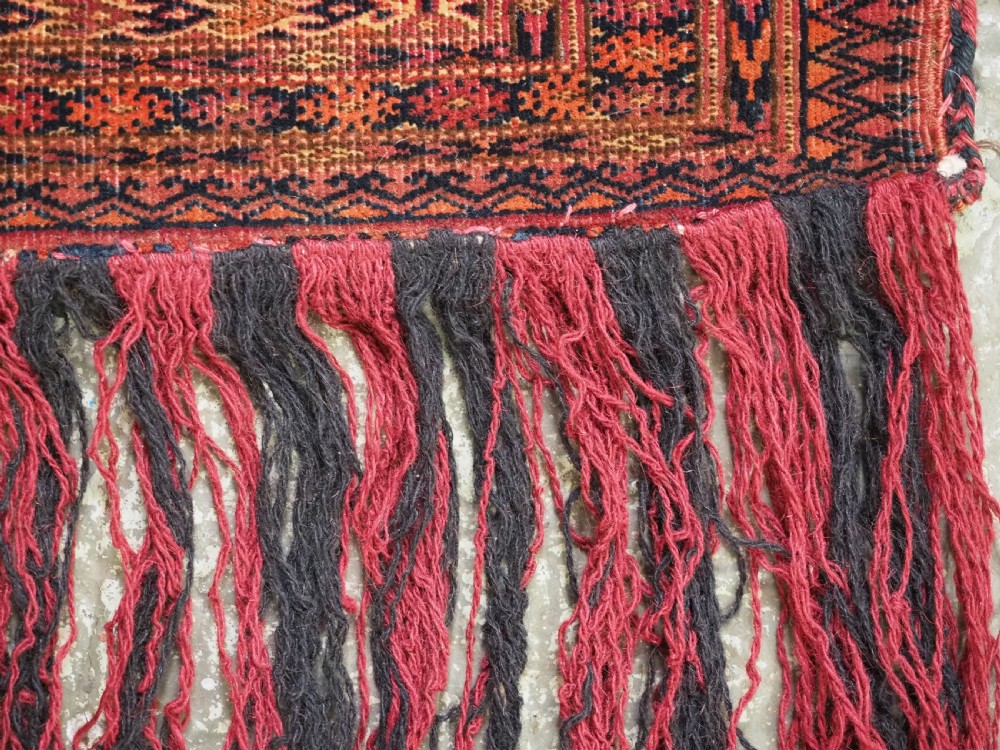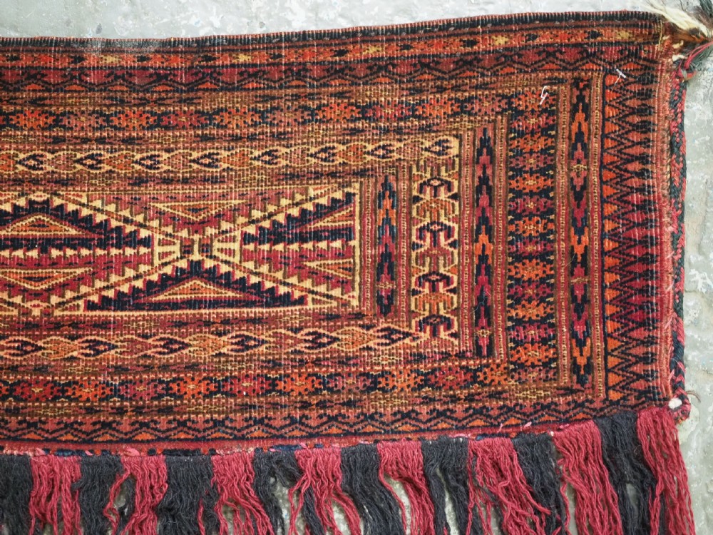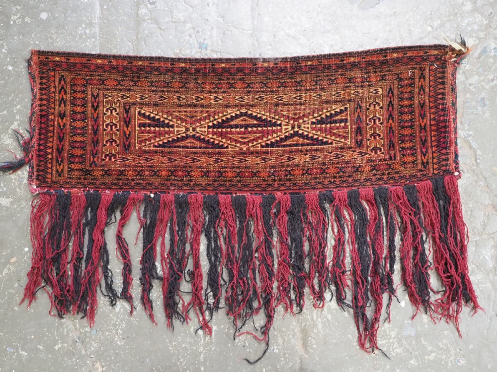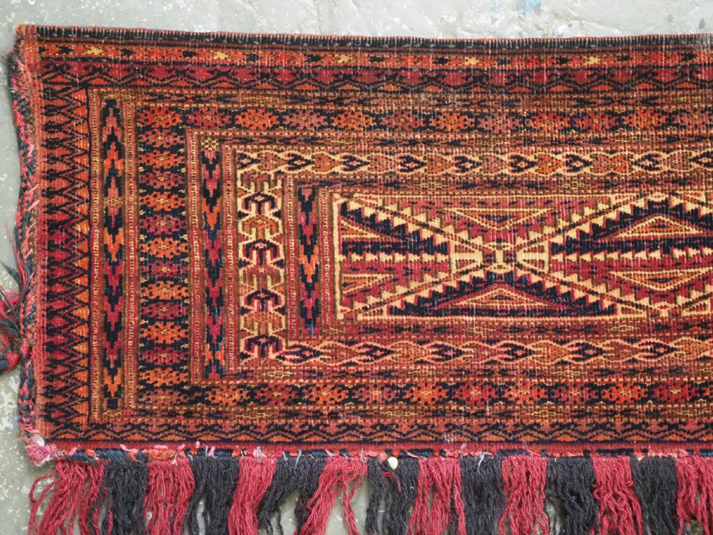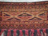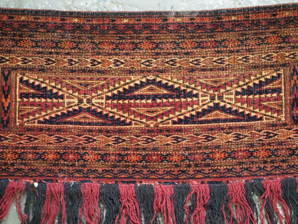 Size: 2ft 7in x 10in (78 x 26cm) face size excluding tassels. Antique Tekke Turkmen torba of fine weave and small size, with a scarce design to the central panel. Torba are shallow wall bags used mainly in tents or yurts for the storage of personal belongings, they were also used to decorate the sides of a camel in a wedding procession. Often only the piled face survives and the plain weave backs have been removed. Circa 1880 or earlier. The torba is in very good condition with even wear and medium pile, the original plain back has been removed at some point in the torba's history. Note the original long tassels in alternating colours. The torba still retains a 'smoked' feel, from the wood and peat fires that burnt within the Yurt. Stock Number: D-0063. All of our prices include FREE WORLD WIDE EXPRESS DELIVERY by DHL. To purchase any item please click on the payment link. We are also happy to accept most payment methods including American Express, bank transfers, debit & credit cards. To purchase by card over the telephone, please contact us on 01608 652111 or 0044 1608 652111 from outside the UK. Internal Ref: D-0063