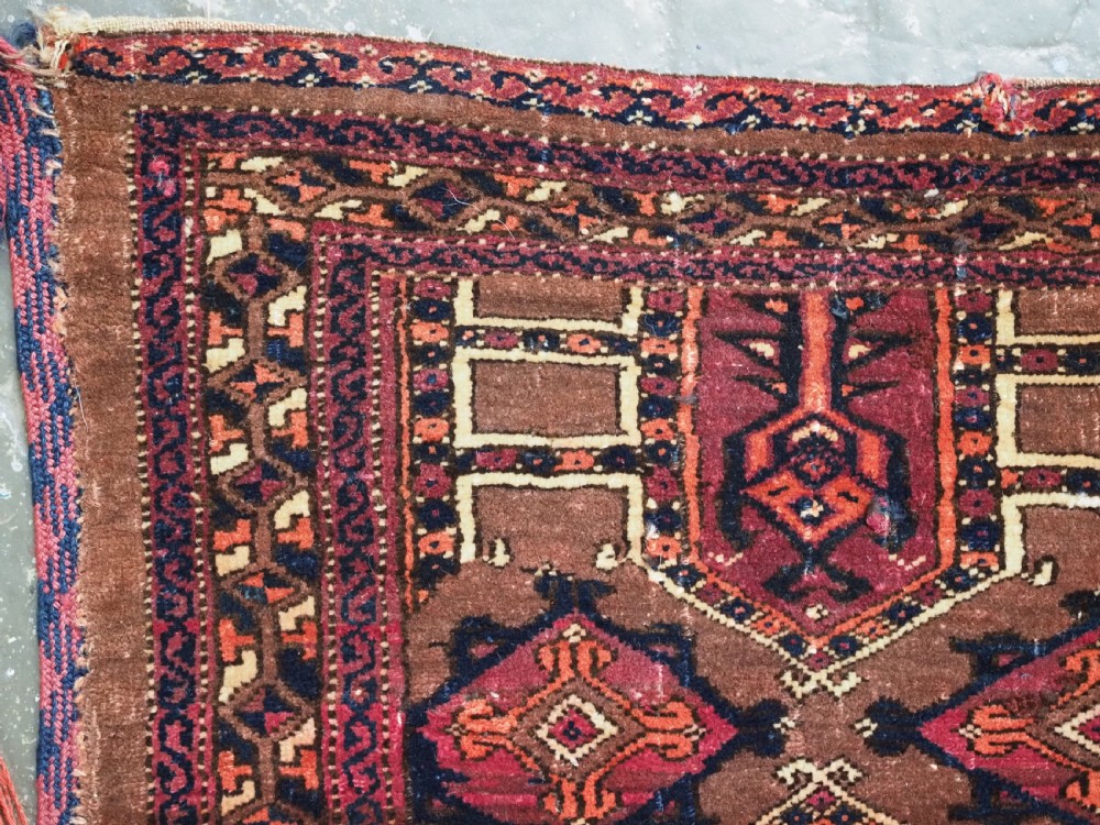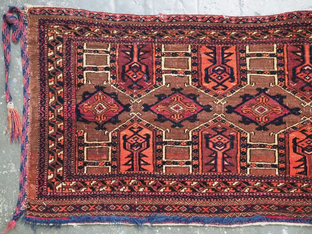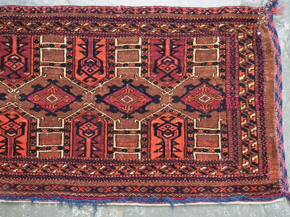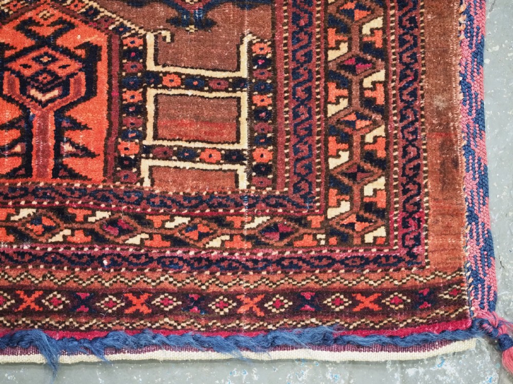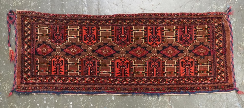 Size: 4ft 3in x 1ft 7in (180 x 48cm) face size. Antique Saryk Turkmen torba face with 'kedjebe' design. Circa 1880. A good torba face with a very well drawn example of the 'kedjebe' design, with excellent colour and good wool. These torba were used to decorate the side of a camel during a Turkmen wedding procession, these were prized possessions and formed part of the wedding dowry. The were kept as heirlooms and displayed inside the yurt. This example is of firm, tight weave, with depressed warps giving a ridged back and a pelt like handle. The design is associated with weddings. The torba is in excellent condition with very slight wear and good pile. The back has been removed at some time in the past. Stock Number: D-2472. All of our prices include FREE WORLD WIDE EXPRESS DELIVERY by DHL. To purchase any item please click on the payment link. We are also happy to accept most payment methods including American Express, bank transfers, debit & credit cards. To purchase by card over the telephone, please contact us on 01608 652111 or 0044 1608 652111 from outside the UK. Internal Ref: D-2472