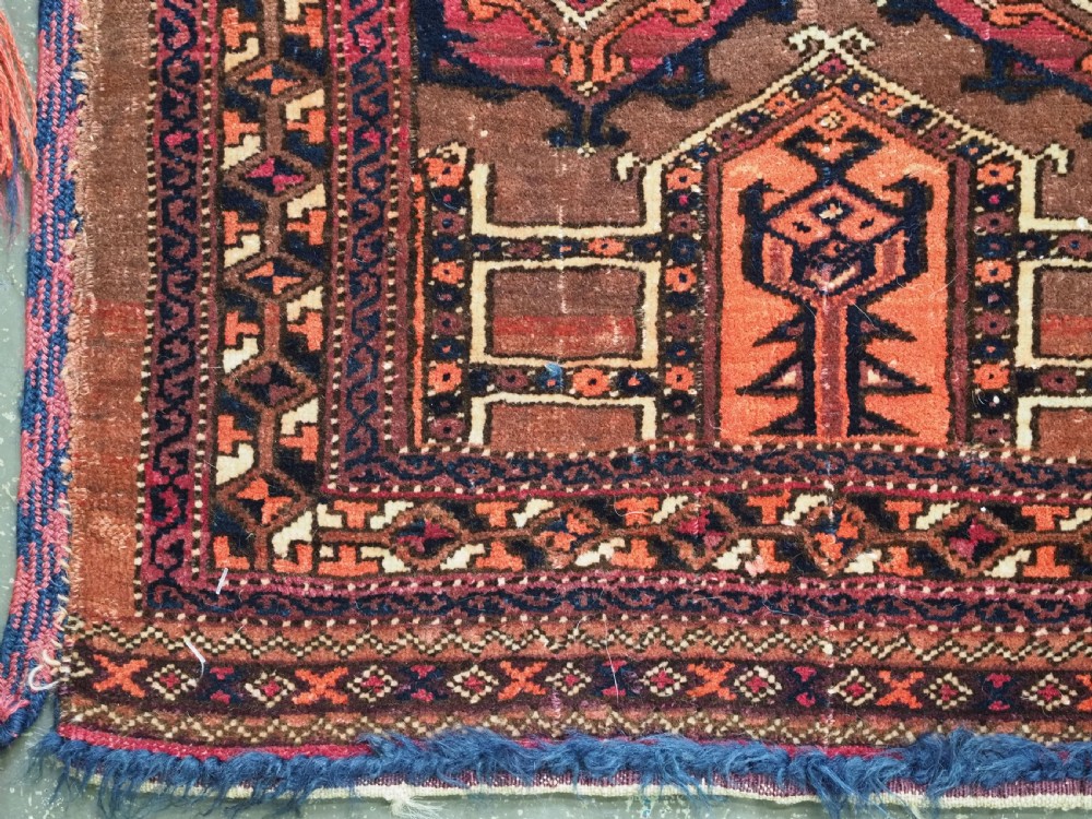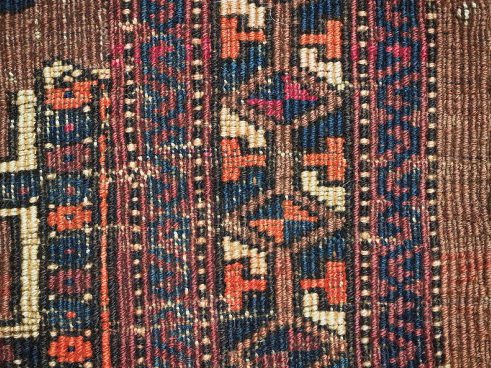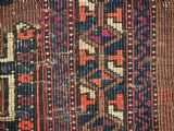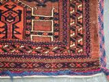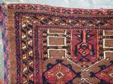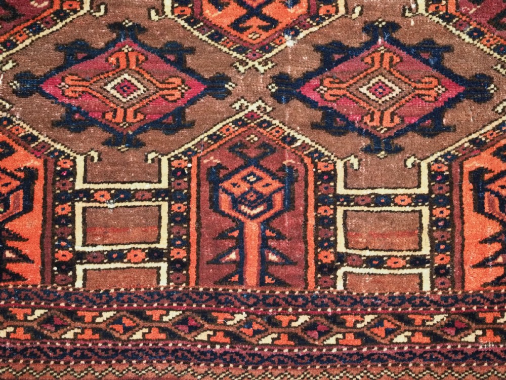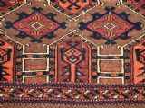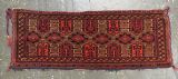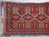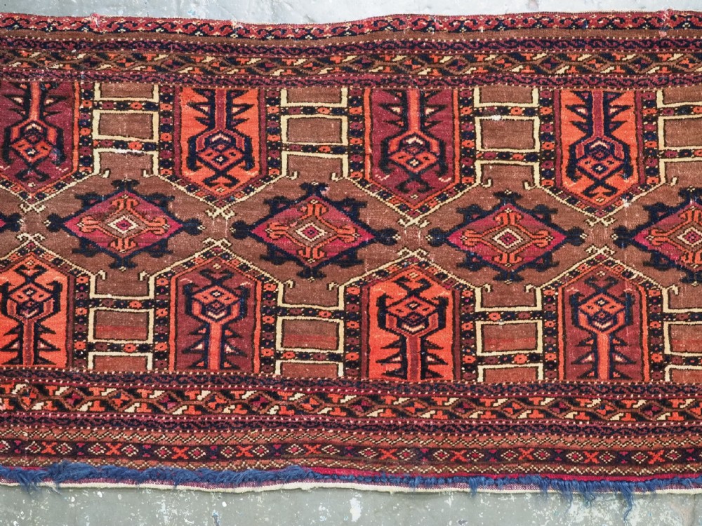 Size: 4ft 3in x 1ft 7in (180 x 48cm) face size. Antique Saryk Turkmen torba face with 'kedjebe' design. Circa 1880. A good torba face with a very well drawn example of the 'kedjebe' design, with excellent colour and good wool. These torba were used to decorate the side of a camel during a Turkmen wedding procession, these were prized possessions and formed part of the wedding dowry. The were kept as heirlooms and displayed inside the yurt. This example is of firm, tight weave, with depressed warps giving a ridged back and a pelt like handle. The design is associated with weddings. The torba is in excellent condition with very slight wear and good pile. The back has been removed at some time in the past. Stock Number: D-2472. All of our prices include FREE WORLD WIDE EXPRESS DELIVERY by DHL. To purchase any item please click on the payment link. We are also happy to accept most payment methods including American Express, bank transfers, debit & credit cards. To purchase by card over the telephone, please contact us on 01608 652111 or 0044 1608 652111 from outside the UK. Internal Ref: D-2472