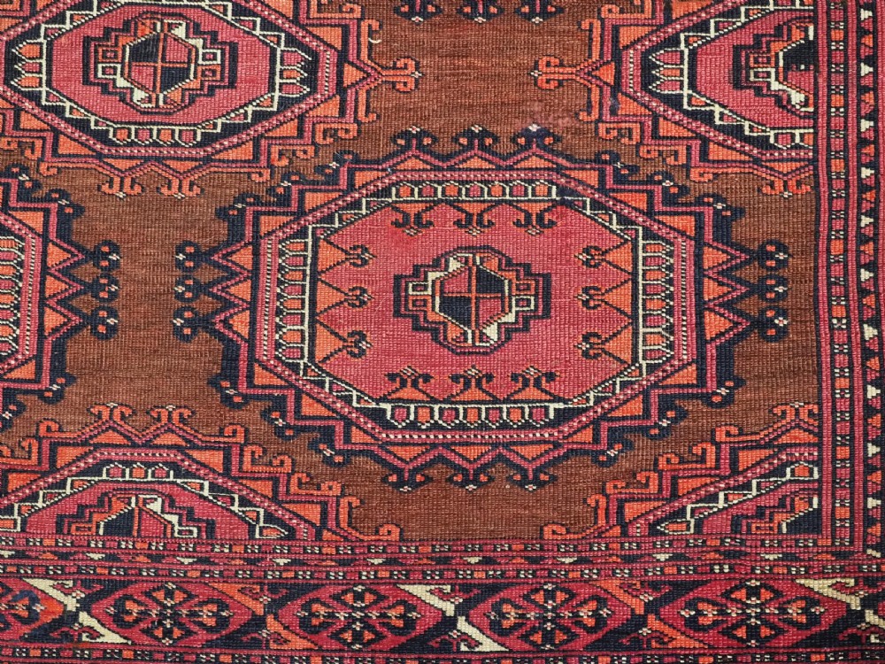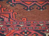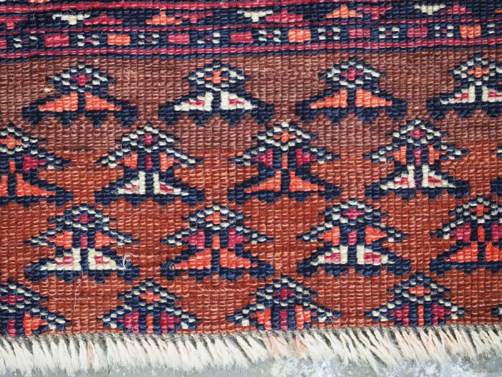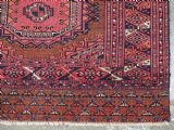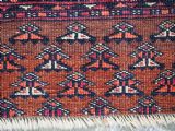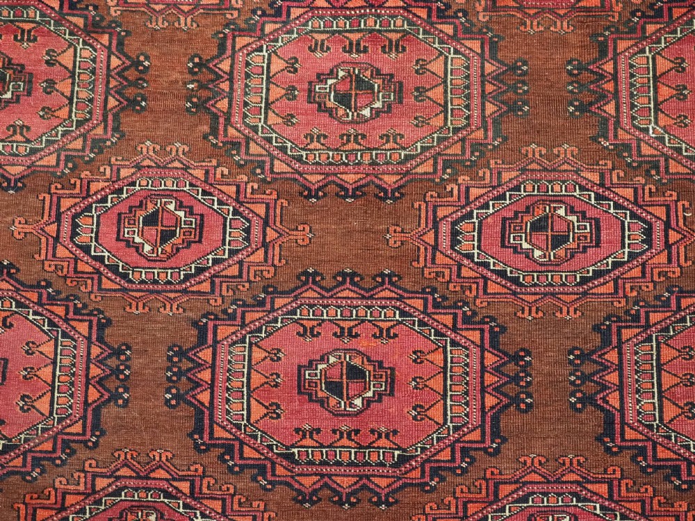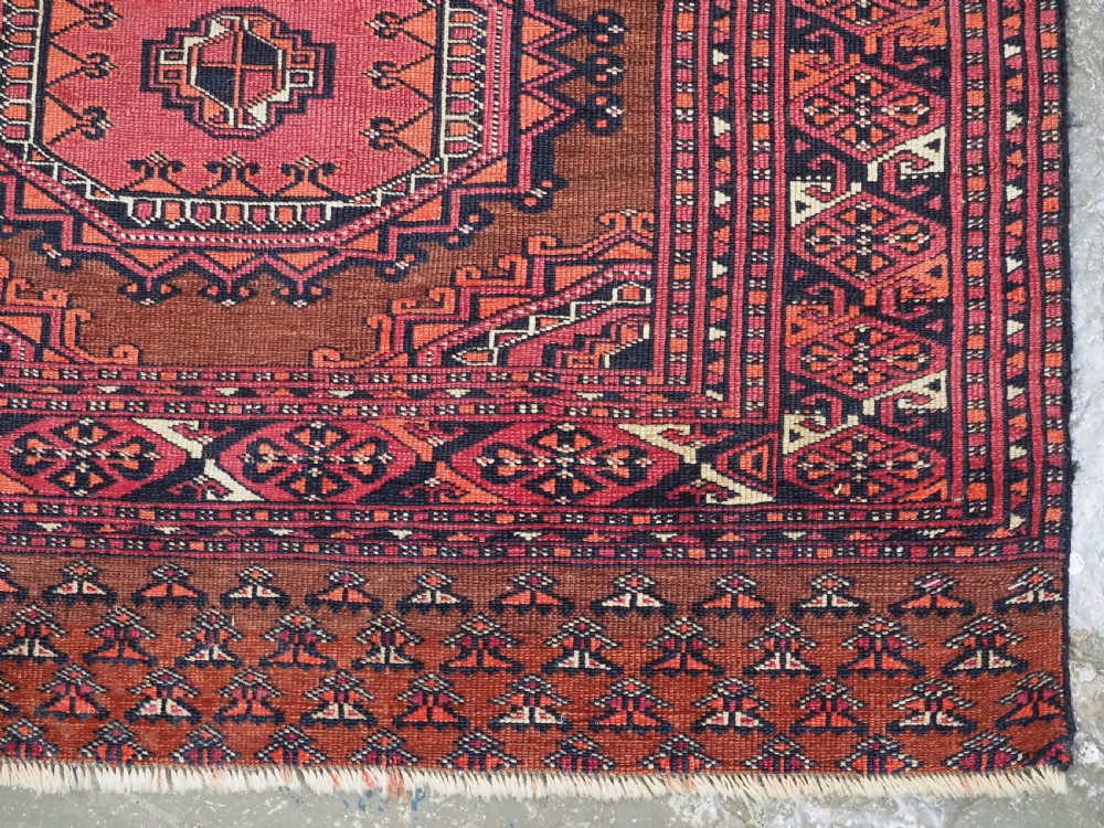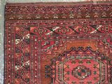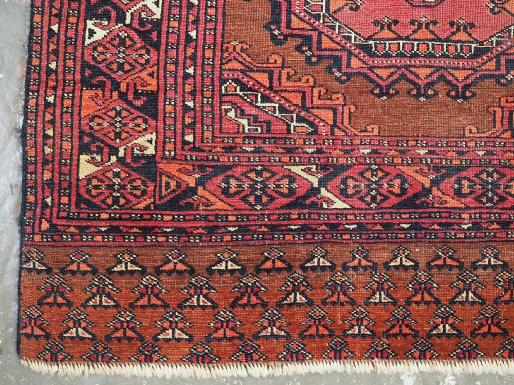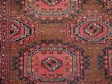 Size: 5ft 3in x 3ft 4in (160 x 102cm). Antique Saryk Turkmen chuval face with six large 'Salor' turreted guls. Circa 1880 or earlier. A good Saryk Turkmen chuval face with six large Salor guls, each centred with a 'chuval' gul and two complete smaller turreted guls of the same design, the lower elem panel is filled with traditional Saryk 'flowering shrub' design or 'dancing ladies' as it is often referred to. All of the whites are in ivory wool and the crimson colour in the guls is cochineal dyed wool. The weave is fine; this is an good example of this group of Saryk weaving. The chuval face is in excellent condition with even wear and medium pile. Stock Number: D-0632. All of our prices include FREE WORLD WIDE EXPRESS DELIVERY by DHL. To purchase any item please click on the payment link. We are also happy to accept most payment methods including American Express, bank transfers, debit & credit cards. To purchase by card over the telephone, please contact us on 01608 652111 or 0044 1608 652111 from outside the UK. Internal Ref: D-0632