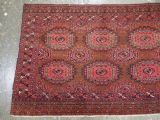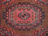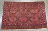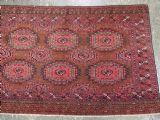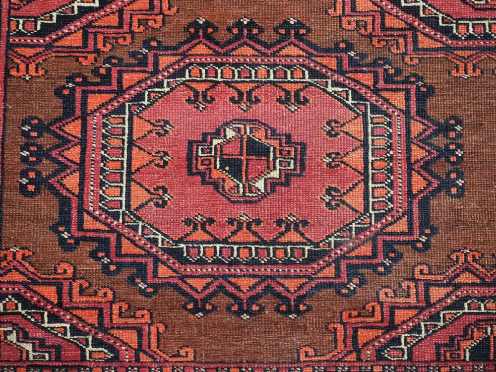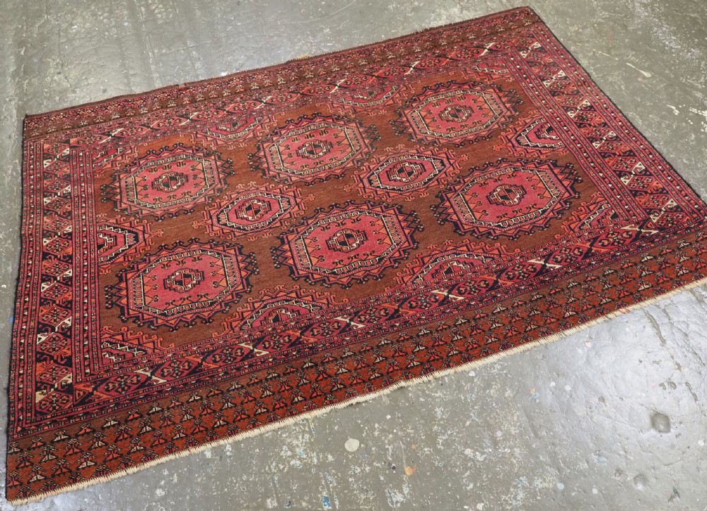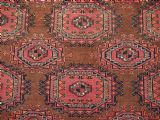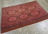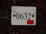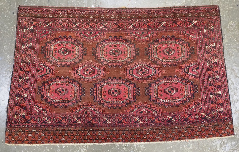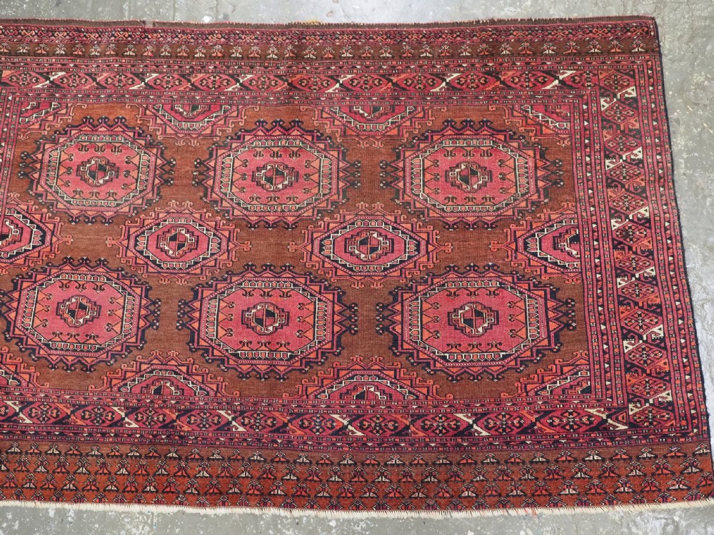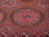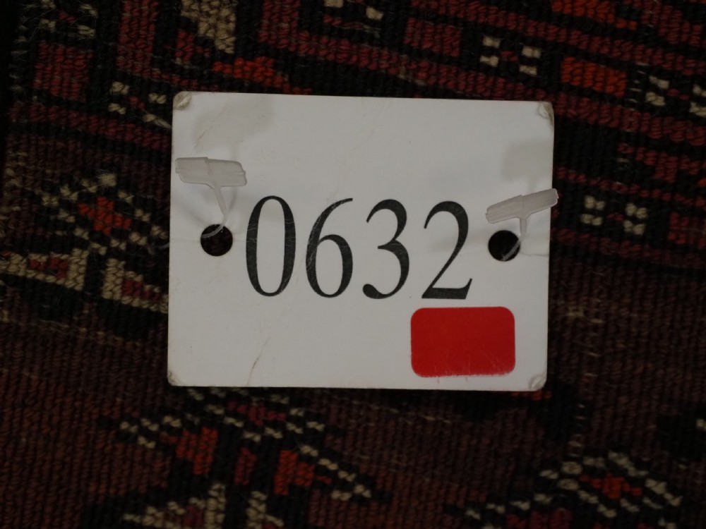 Size: 5ft 3in x 3ft 4in (160 x 102cm). Antique Saryk Turkmen chuval face with six large 'Salor' turreted guls. Circa 1880 or earlier. A good Saryk Turkmen chuval face with six large Salor guls, each centred with a 'chuval' gul and two complete smaller turreted guls of the same design, the lower elem panel is filled with traditional Saryk 'flowering shrub' design or 'dancing ladies' as it is often referred to. All of the whites are in ivory wool and the crimson colour in the guls is cochineal dyed wool. The weave is fine; this is an good example of this group of Saryk weaving. The chuval face is in excellent condition with even wear and medium pile. Stock Number: D-0632. All of our prices include FREE WORLD WIDE EXPRESS DELIVERY by DHL. To purchase any item please click on the payment link. We are also happy to accept most payment methods including American Express, bank transfers, debit & credit cards. To purchase by card over the telephone, please contact us on 01608 652111 or 0044 1608 652111 from outside the UK. Internal Ref: D-0632