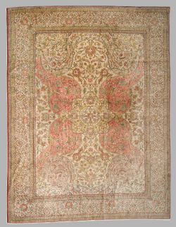 This is an outstanding copy of a 19th century Sultanabad carpet of large size. The large scale floral design is on an 'antique' ivory ground.