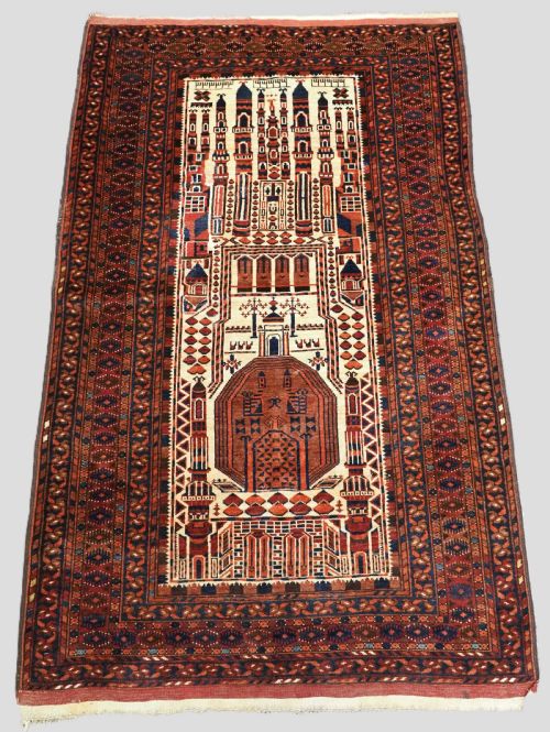 This example is very well made with excellent glossy wool; the red ground is a very pleasing colour. The inner curl leaf border is also of interest. An excellent example of an Afghan Purdah (door hanging).