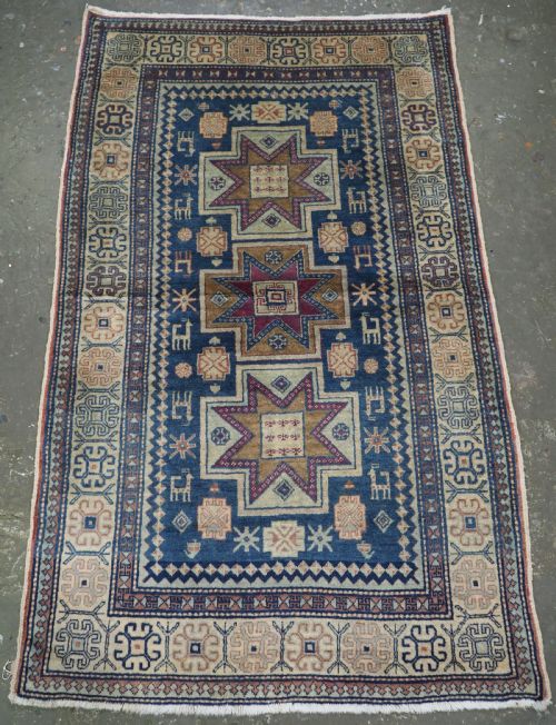 The example offered here has three vertical rows of seven linked octogens, on a dark indigo blue ground. The border design is also associated with rugs from Gendje. This is a striking large size furnishing rug, that will make a statement wherever it is used.