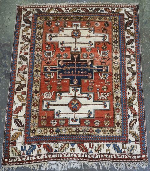 An interesting and scarce Kazak rug, a related example is published in 'Oriental Rugs Vol 1 Caucasian' by Ian Bennett, page 141, plate 154. Bennett suggests that whilst the Gendje region is the most likely origin, it is possible that the rugs could be from the Karabagh region, due to design elements that are related to Chelaberd 'eagle' kayak rugs.