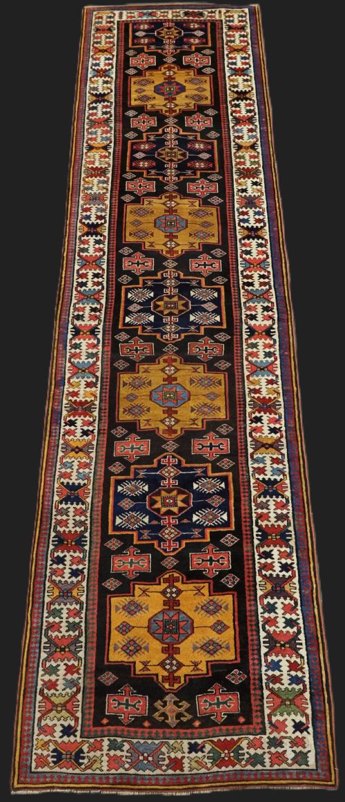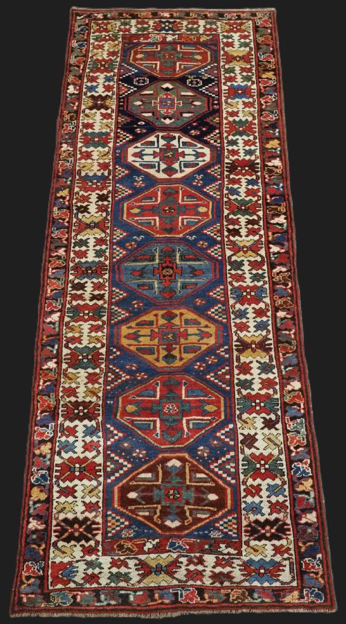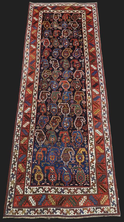 This rug is an excellent example of Luri tribal weaving, with a field of five latch hook medallions. The medallions are filled with rosettes and other tribal devices, the indigo blue field contains many small rosette flowers and tribal designs. The border designs are typical of Luri work. The rug has a very rustic, tribal feel; note how the drawing of the medallions is very irregular and the rug has a slightly irregular shape.