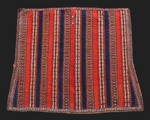 This horse saddle rug belongs to a small group of well known ceremonial horse covers, rugs and associated items woven by the Yomut Turkmen tribes of North Eastern Persia. The saddle rug in finely knotted with dense velvet like pile, giving the item the strength required for use. The banded design in shades of madder red, indigo blue and ivory is typical of this group of weavings. Note the slit in the rug, top centre for the pommel. There is an early UK customs tag attached to one corner.