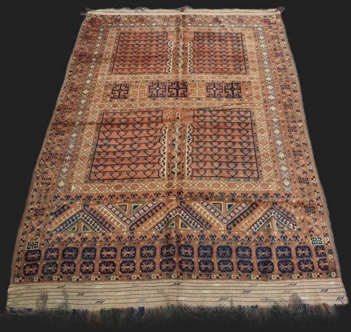 This example is woven with a traditional Ersari design; the four panels in the middle are said to be the windows to Paradise, these are filled with bird heads. The ensi is unusual in its weave, this may point to an Afghan origin or quite possibly it was made in Turkmenistan under Russian influence for the Russian market.