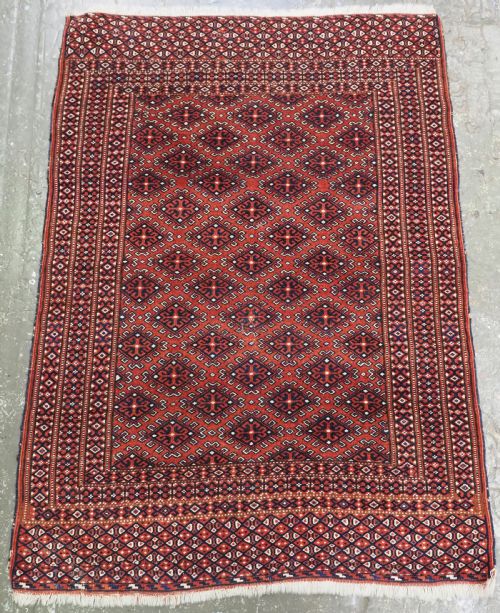 A very interesting rug from the region of northern Afghanistan and the borders of Turkmenistan; the rug has an unusual repeat small medallion design of extended diamond shaped guls, on a orange / red madder ground; the border designs are associated with both Baluch and Ersari Turkmen tribal weavers. The old collectors label attached to the rug attributes it to the 'Taimani Baluch'; although it is probable that the rug is by a Turkmen group related to the Ersari. The rug is without any doubt of some age and a rare design, further study would shed some more light on this rare and small group of Ersari rugs.
